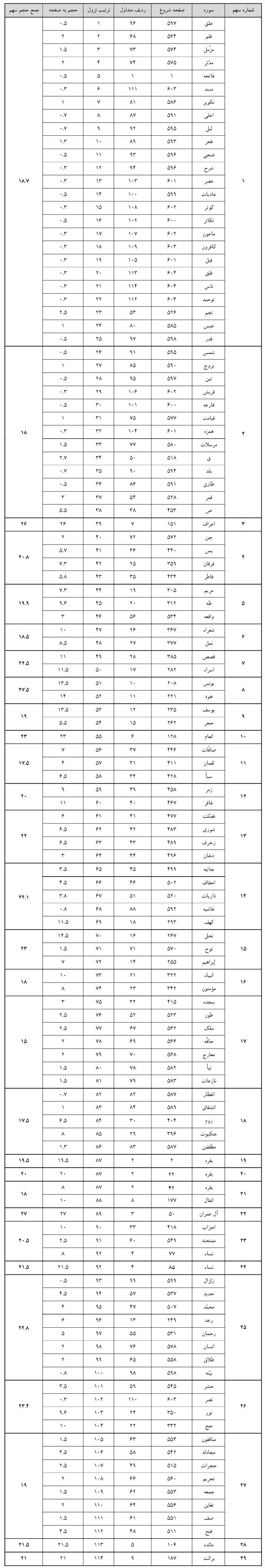 این فایل همچنین شامل جدول کامل محاسبات حجم سورههای قرآن هم هست که علاقمندان میتوانند سیر دلخواه خود را بر اساس اطلاعات پایهی آن طراحی کنند.