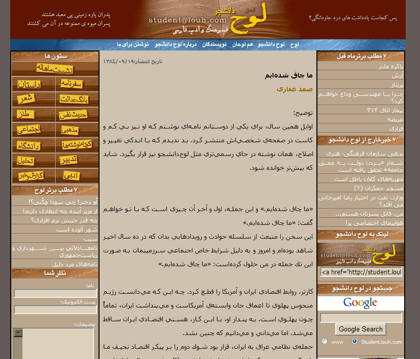 امروز کار به جایی میرسد که شهر رفاهزدهی ما، در پسِ همهی سیاهنماییهایی که مردم فقیرند و ندارند و ...، آن چنان چاق شده است که قطع 5 روزهی خطوط تلفن همراه همهمان را فلج میکند. قطع تلفن ثابت، که منجر به قطع اینترنت میشود، را نگفتم. فقط تلفن همراه. شهر و کشور در وضعیت جنگی آب و برق منظمی ندارد. چه برسد به... . میبینی؟ عقلای قوم خیال کردهاند هنری دارد ریختن پول بیصاحب نفت در بازار شهر. شاید ملوک ما فرق کشورداری و پرواربندی گاو را به درستی نمیدانند. خیال کردهاند مردم هر چه بیشتر بخورند و تنوع و تکثر و تهاجم خوردنی و پوشیدنی و خریدنی بیشتر بشود، نظام را بیمه کردهاند. نمیدانند که انقلاب اسلامی قرار بود نظام عالم را به هم بریزد. نه این که خودش با زور و منت بشود یکی از دهها کشور در حال توسعهی غربزدهی بیهویت. خیال کردهاند همین که سازمان تبلیغات اسلامی داشته باشیم حراست از مذهب و اعتقادات مردم را کفایت میکند. این عین سکولاریسم است. توسعهی اقتصادی جای خود محترم و تبلیغات مذهبی جای خود. هر کسی کار خودش!!! پس این چه فرقی کرد با بقیهی دنیا؟