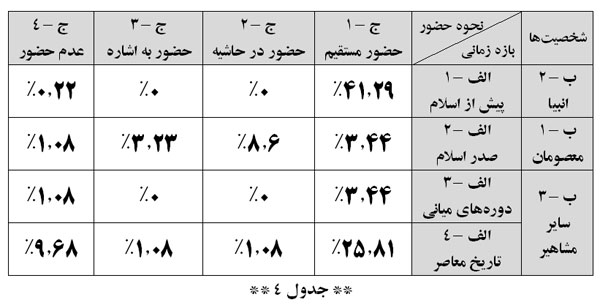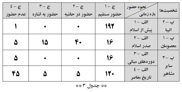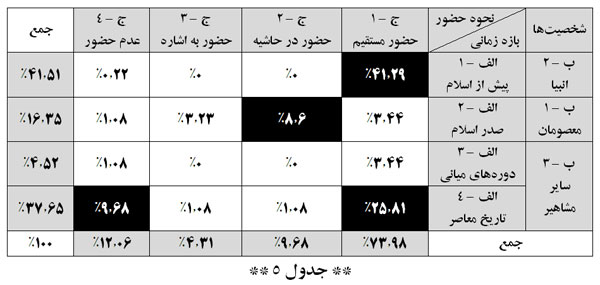 - علیرغم تصور اولیه در مورد «نمایش معارفی» موضوعات تاریخی مربوط به صدر اسلام در ردهی سوم فراوانی قرار دارد.