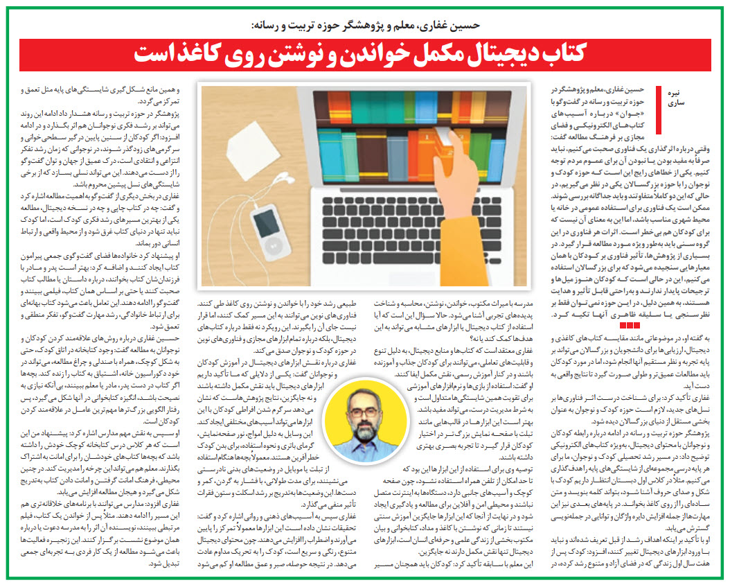 غفاری معتقد است که کتابها و منابع دیجیتال، به دلیل تنوع و قابلیتهای تعاملی، میتوانند برای کودکان جذاب و آموزنده باشند و در کنار آموزش رسمی، نقش مکمل ایفا کنند. او گفت: استفاده از بازیها و نرمافزارهای آموزشی برای تقویت همین شایستگیها متداول است و به شرط مدیریت درست، میتواند مفید باشد. بهتر است این ابزارها در قالبهایی مانند تبلت با صفحه نمایش بزرگتر در اختیار کودکان قرار گیرد تا تجربه بصری بهتری داشته باشند.